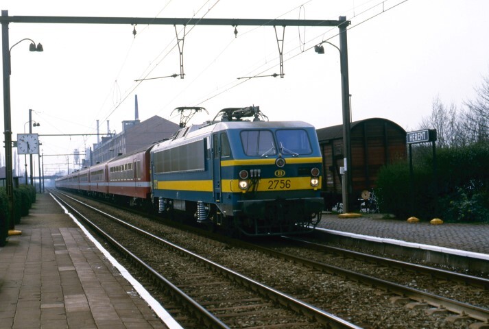 Elektrische locomotief 2756 staat aan het perron met een stam M 4-rijtuigen. We zien een stationsnaambord, perronverlichting, een perronklok en een gesloten goederenwagen.