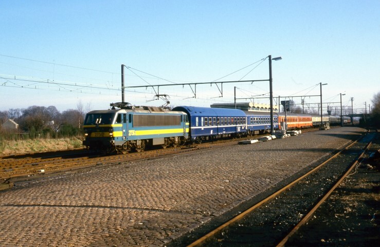 Deze fotogroep bevat twee dia's. Elektrische locomotief 2756 sleept een internationale reizigerstrein. De locomotief is blauw geschilderd met gele zichtbaarheidsstrepen. De trein is samengesteld uit diverse rijtuigen van verschillende spoorwegmaatschappijen. Hij rijdt ter hoogte van een verlaten goederenkoer. Er zijn ook enkele lichtseinen te zien. Schenking van Myriam Hendrickx.