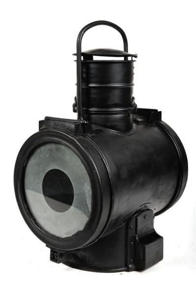 BeschrijvingDeze zwarte cilindervormige lantaarn op ronde voet werd achter de gekleurde lenzen van een seinpaal geplaatst. Bovenaan bevindt zich een handvat.