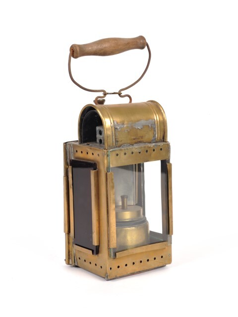 BeschrijvingVierkante lantaarn met drie glazen zijden: twee witte en een rode. De lantaarn heeft een beweegbaar handvat. Achteraan is een haak om de lantaarn op te hangen. Binnenin zit een reservoir voor petroleum en een lont.