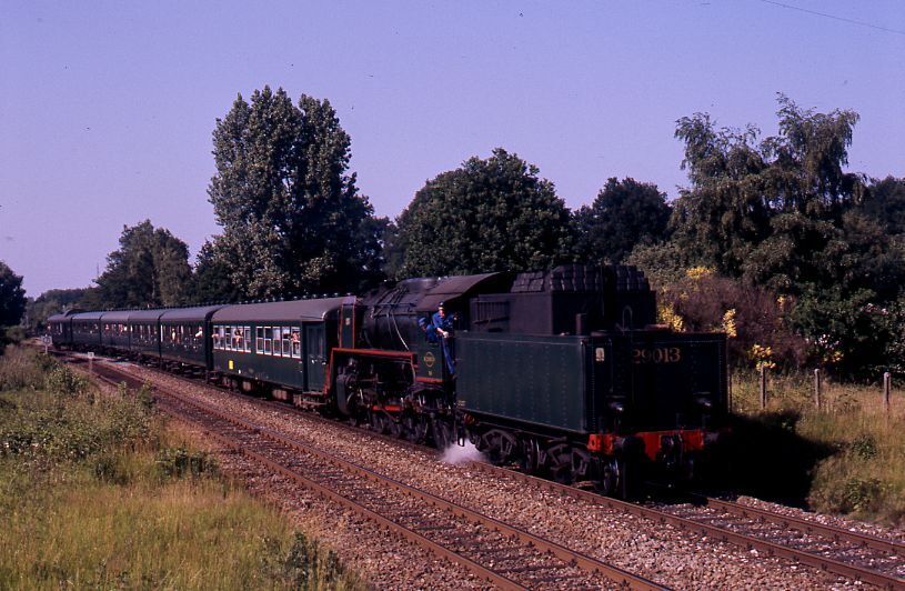 Deze fotogroep bevat drie dia's. Stoomlocomotief 29.013 sleept een K-rijtuig en enkele L-rijtuigen tijdens een historische stoomrit. De locomotief rijdt met de tender vooraan. De passagiers staan bij de ramen.