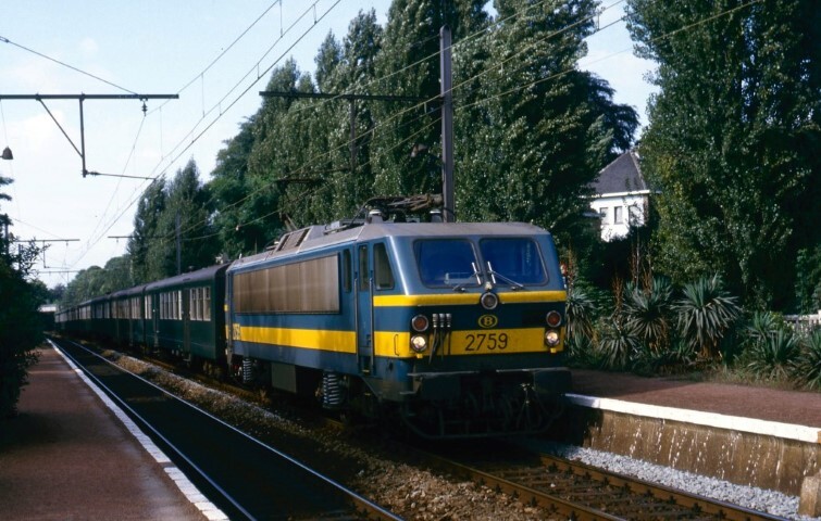 BeschrijvingElektrische locomotief 2759 staat met een reizigerstrein aan het perron. De trein is samengesteld uit M 2-rijtuigen.