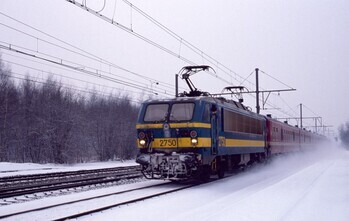 BeschrijvingDeze fotogroep bevat twee dia's. Elektrische locomotief 2750 sleept M 4-rijtuigendoor een besneeuwd landschap.