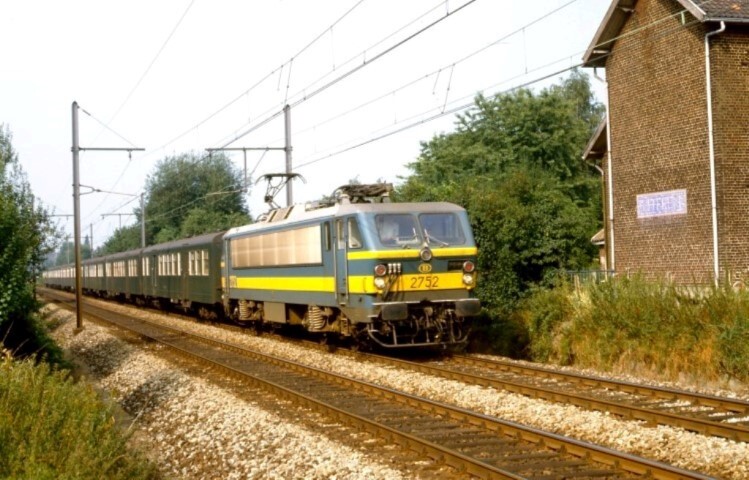 Elektrische locomotief 2752 is onderweg met een lange sleep M 2-rijtuigen. De locomotief is blauw geschilderd met brede gele banden. De rijtuigen zijn groen. Rechts is een voormalige baanwachterswoning te zien. De bovenleidingspalen zijn van het type 1949 met hun typische afronding bovenaan. Schenking van Myriam Hendrickx.
