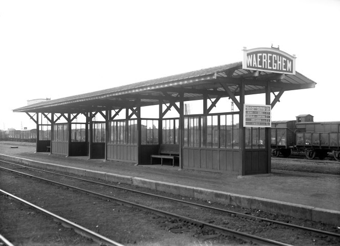 De glasplaat toont een luifel met houten timmerwerk, windschermen en zitbanken. Tegen het schuildak hangt aan beide zijden een stationsnaambord. Onder de luifel zien we een treinaankondiger waarop diverse bestemming en sporen vermeld staan. Op de achtergrond staan open en gesloten goederenwagens opgesteld.