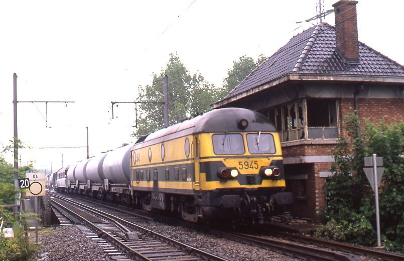 Deze fotogroep bevat drie dia's. We zien de voor- en achterzijde van een onkruidverdelgingstrein. Deze trein wordt gesleept door diesellocomotief 5945 en geduwd door locomotief 5950. De trein rijdt voorbij een vervallen seinhuis en het perron in de stopplaats Hofstade. Op het perron staat een wachthuisje met stationsnaam. Deze stopplaats ligt langs spoorlijn 27B (Mechelen - Weerde). Schenking van Myriam Hendrickx.