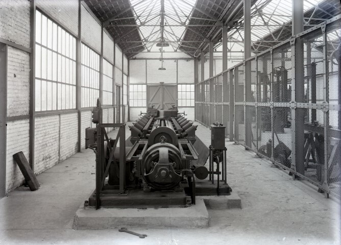 De glasplaat toont een hal van de werkplaats waarin een werkbank staat om de kop van een spoorstaaf van scherpe kanten te ontdoen. Links en rechts zien we cilinders die vermoedelijk voor de verplaatsing van de spoorstaven doorheen de slijpmachines instaan. Met behulp van draaiwielen worden de beitels voor het frezen van de spoorstaaf afgesteld. Geklonken pijlers en een stalen gebinte ondersteunen het dak van glas en hout.
