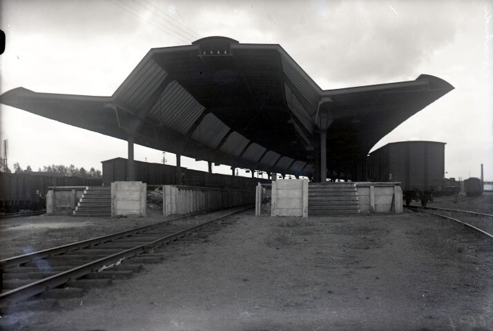 BeschrijvingDe glasplaat toont de perrons waar goederen werden overgeslagen. Een luifel overkapt de drie sporen. Op de sporen staan open en gesloten goederenwagens opgesteld.