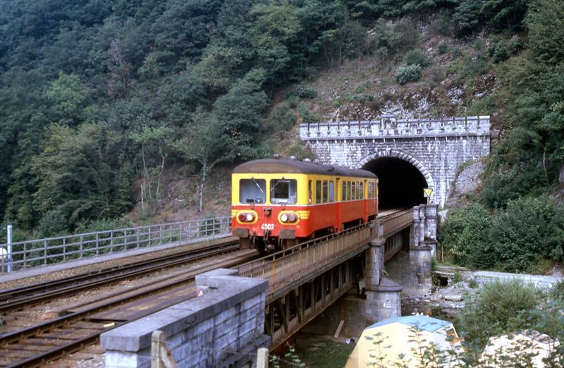 BeschrijvingMotorwagen 4502 is net de tunnel van Ardenne uitgereden en bevindt zich op een spoorbrug over de Lesse.