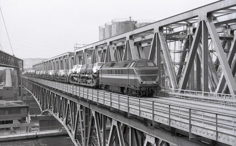 Deze locomotief behoort tot de reeks 60. Ze sleept een homogene goederentrein, bestaande uit wagens voor het transport van auto's. De trein bevindt zich op het gedeelte van de brug over het Albertkanaal. Deze brug werd tijdens de eerste Wereldoorlog door Belgische vrijwilligers en Russische krijgsgevangenen gebouwd in opdracht van de Duitse bezetter. Ze werd in februari 1917 in gebruik genomen. De vakwerkbrug bestaat uit stalen balken die op pijlers in gewapend beton rusten. De totale lengte bedraagt 523 meter. Links zien we de nieuwe spoorbrug die, naar aanleiding van de elektrificatie van lijn 24 (Tongeren – Montzen), in opbouw is. Schenking van Myriam Hendrickx.
