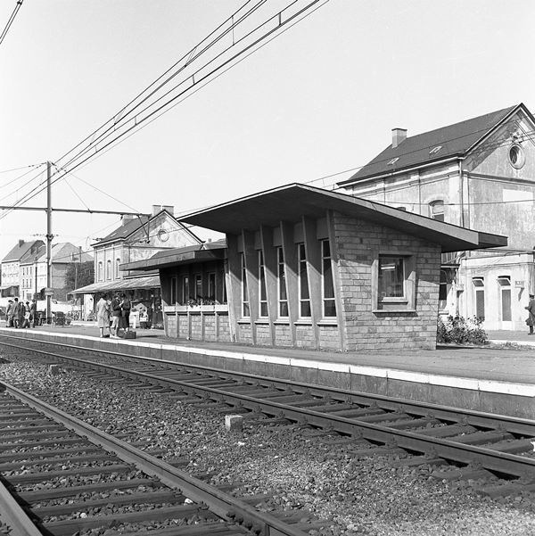 BeschrijvingDe foto toont een schuilhuisje opgetrokken uit natuursteen op het perron in station Libramont. Ernaast staan enkele reizigers te wachten op hun trein. In de achtergrond zien we het stationsgebouw.