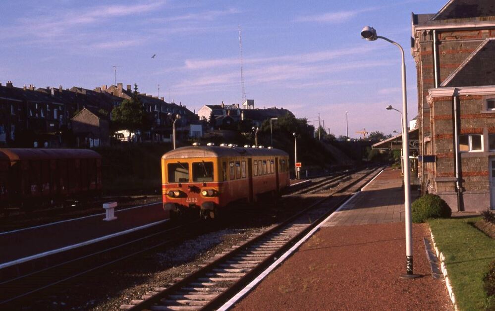 Motorwagen 4502 staat aan het perron in station Bastenaken. Rechts zien we het stationsgebouw, met kleine luifel boven het perron. Links staat een gesloten goederenwagen. Dit station ligt langs spoorlijn 163 (Libramont - Sankt-Vith). Schenking van Myriam Hendrickx.