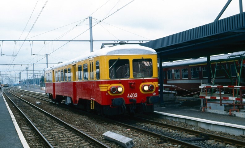 BeschrijvingDe pas herschilderde motorwagen 4403 staat aan het perron. Op het moment van de opname werden werken uitgevoerd aan het perron en de overkapping.