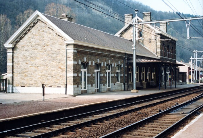 BeschrijvingDe foto toont het station met luifel aan de kant van de sporen. Het perron is met zitbanken, een informatiezuil en een spoornummer uitgerust.