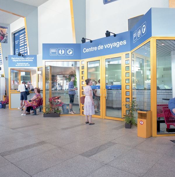 Ce groupe de photos comprend 28 négatifs. Ils montrent le nouveau Travel cente de l'ancienne gare de Liège-Guillemins. Les titres de transports, les dépliants, les horaires, les réservations et les informations touristiques peuvent être obtenus auprès du personnel des guichets.