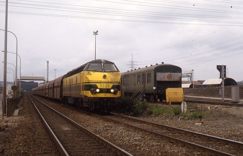 Diesellocomotief 5535 sleept een goederentrein met tremelwagens type fals voorbij Val-Saint-Lambert. Naast de trein staat een oud reizigersrijtuig op een doodlopend spoor.
