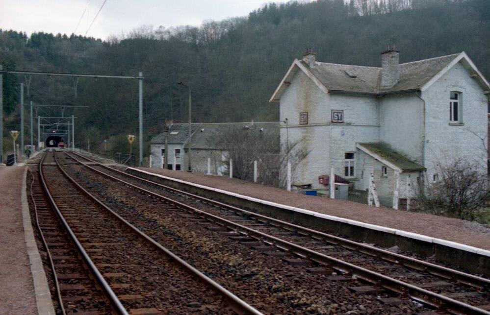 De fotogroep bevat vier negatieven. Ze tonen het stationsgebouw, de perrons en de tunnel nabij station Sy. Dit is een spoorweghalte langs spoorlijn 43 (Luik - Marloie). Het voormalige stationsgebouw staat er nog steeds, maar is niet meer in gebruik. De werken aan de bovenleiding richting Luik zijn nog volop bezig. Naast de sporen staan snelheidsverminderingsborden die de machinist een tijdelijke beperking van 40 km/u opleggen.