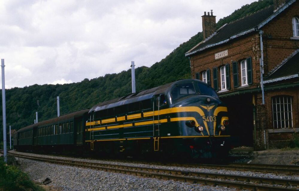 TitelDiesellocomotief 5403 met een reizigerstrein in station Dave