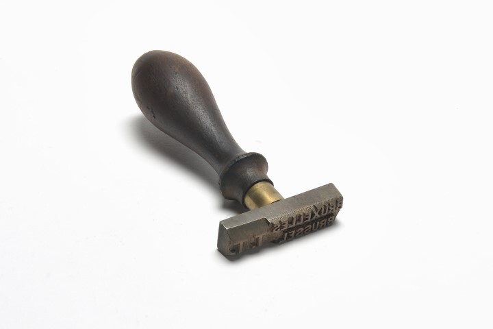 TitelMetalen stempel 'Bruxelles Brussel T.T.' met houten handvat
