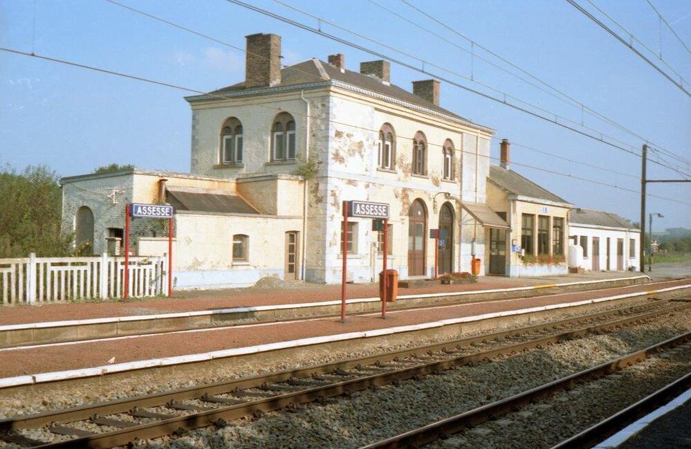 BeschrijvingDeze foto toont het stationsgebouw, de perrons met stationsnaamborden en vuilbakken en de sporen. Station Assesse ligt langs spoorlijn 162 (Namen - Aarlen - Luxemburg). Het is nu een stopplaats.