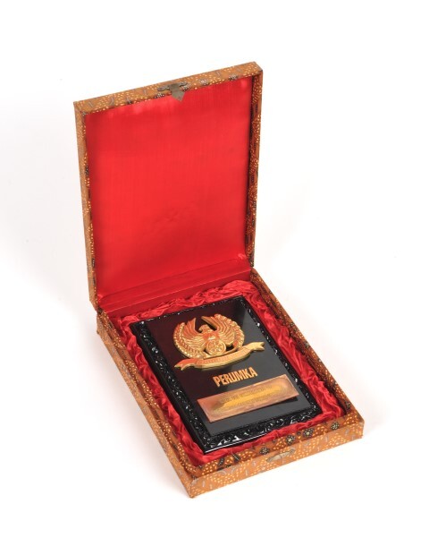 Op een houten plaat met fijn versierde randen staat een embleem bestaande uit een arend die op een treinwiel zit. Hij wordt omringd door een krans. Onder het wiel is een banner met opschrift: 'Wahana Daya Pertiwt' (eerste motorrijtuig). Onder het embleem staat 'Perumka' (Indonesian Public Railway Company) en daaronder op een metalen plaatje: 'With the compliments of the Indonesian Railway Public Corporation'. Achteraan de plaat is een fijn versierde metalen staander.