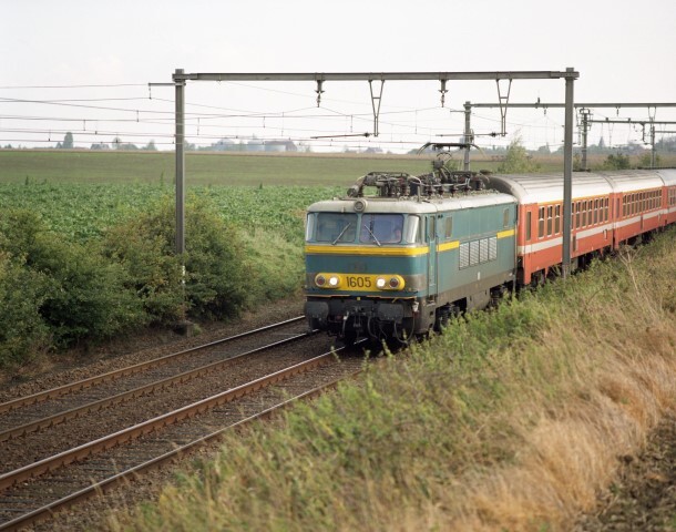 Vierspanningslocomotief 1605 sleept enkele Eurofimarijtuigen type I 6. De blauwe locomotief heeft gele zichtbaarheidsstrepen. De kast van de rijtuigen is oranje geschilderd met een brede witte band en lichtgrijs dak.