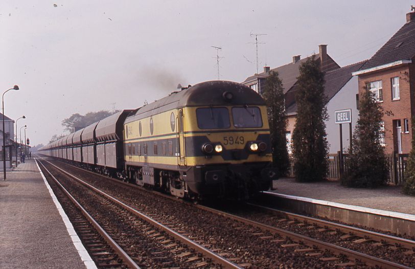 Deze groep bevat twee dia's. Diesellocomotief 5949 sleept een goederentrein met tremelwagens type fals voorbij station Geel. Op de perrons staan verlichtingspalen en een stationsnaambord. Dit station ligt langs spoorlijn 15 (Antwerpen-Centraal - Lier - Hasselt). Schenking van Myriam Hendrickx.