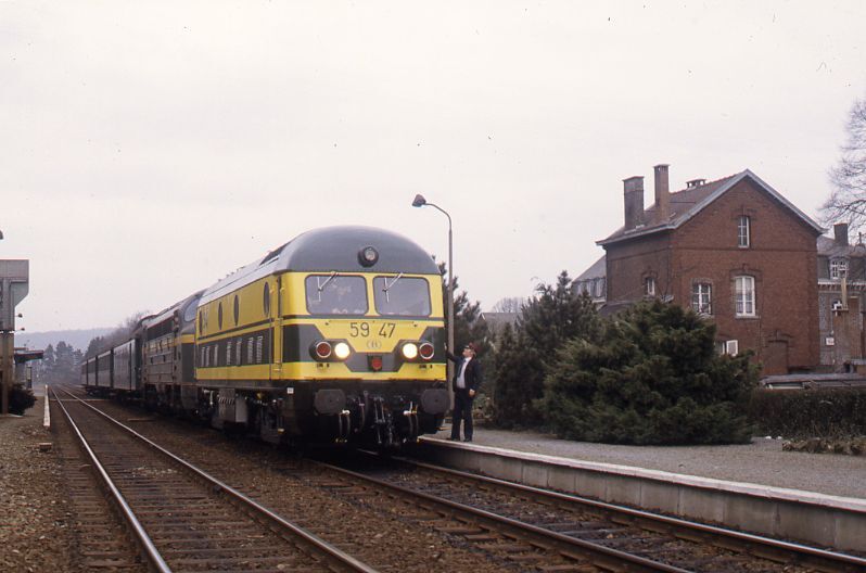Deze fotogroep bevat twee dia's. Diesellocomotief 5947 sleept in dubbeltractie met locomotief 5210 een reizigerstrein. De trein bestaat uit K-rijtuigen, waarvan het eerste een pakwagen is. De stationschef staat op het perron en is in gesprek met de bestuurder. Station Yvoir ligt langs spoorlijn 154 (Namen - Franse grens). Schenking van Myriam Hendrickx.
