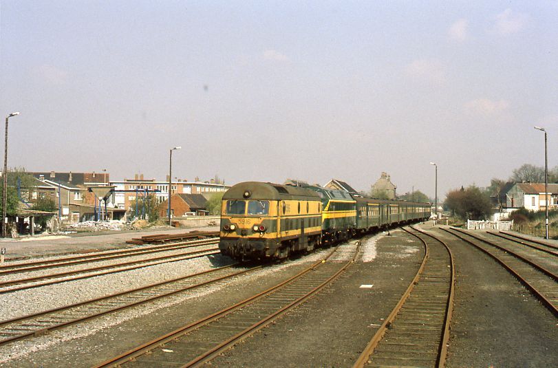 Deze fotogroep bevat drie dia's. Diesellocomotieven 5916 en 6041 slepen een aantal M 3- rijtuigen tijdens een historische rit. Locomotief 5916 is geel geschilderd met brede groene banden. Locomotief 6041 heeft een groene livrei met gele zichtbaarheidsstrepen. Schenking van Myriam Hendrickx.