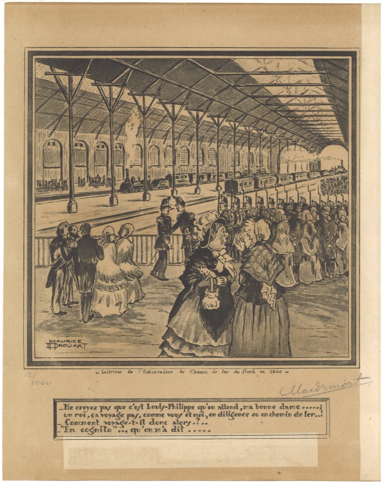Humoristische prent in zwart-wit die de binnenkant van de spoorhallen van de Chemin de fer du Nord te Parijs toont. De hal loopt vol reizigers. Vooraan staan twee vrouwen met elkaar te praten. Onderaan lezen we wat ze tegen elkaar zeggen: "-Ne croyez pas que c'est Louis-Philippe qu'on attend, ma bonne dame.....; un roi, ça voyage pas, comme vous et moi, en diligence ou en chemin de fer..! -Comment voyage-t-il donc alors.?.. -'En cognito'.., qu'on m'a dit....." Schenking van dhr. Marechal.