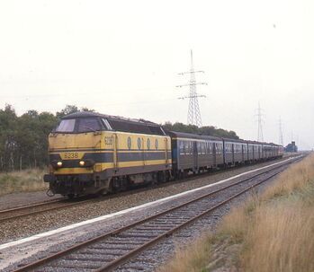 BeschrijvingDiesellocomotief 6238 sleept een lange reizigerstrein bestaande uit M 2-rijtuigen in de buurt van Overpelt.