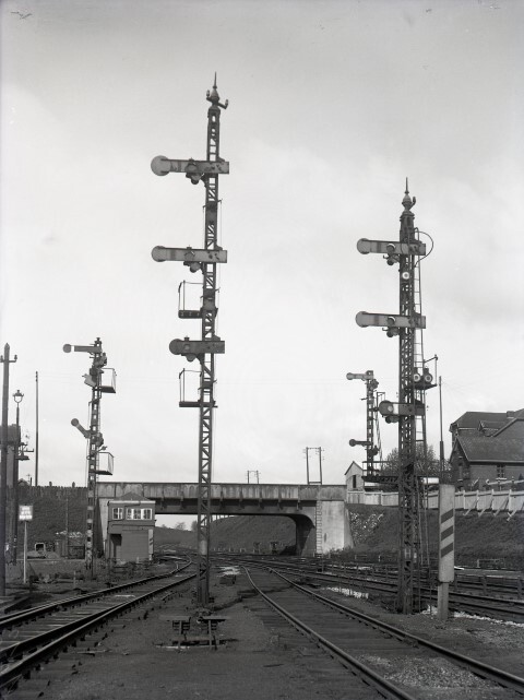 De glasplaat toont vooraan twee oude mechanische richtingsseinen met twee standen. De bovenste arm geeft seinen voor het hoofdspoor, de middelste voor het zijspoor. Links zien we een stopsein voor normaal spoor, rechts een sein voor tegenspoor. De seinpalen zijn met rangeerseinen uitgerust. Een van de rangeerseinen staat open. De seinglazen maken deel uit van de seinarmen en worden met petroleumlampen verlicht. Rechts zien we een naderingsbaken.