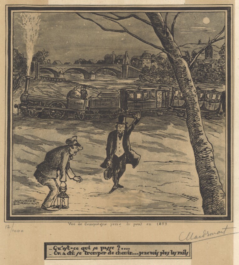 Humoristische prent in zwart-wit die een gestrande stoomtrein voorstelt. Op de achtergrond is een brug en een dorpje getekend. Vooraan staat de machinist. Een reiziger loopt naar hem toe en vraagt: "-Qu'est-ce qui se passe?...." Waarop de machinist antwoordt: "-On a dû se tromper de chemin... je ne vois plus les rails" (tekst onderaan). Schenking van dhr. Marechal.