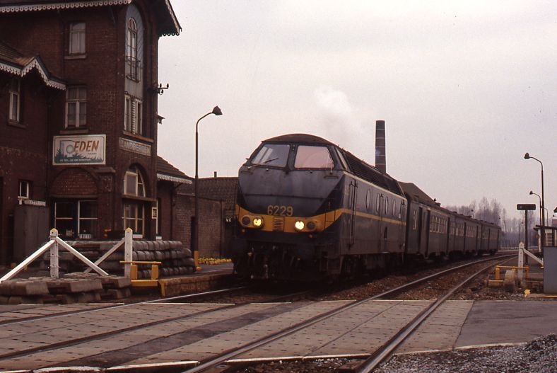 Diesellocomotief 6229 staat aan het perron in station Zandbergen. De locomotief sleept een reizigerstrein bestaande uit M 2-rijtuigen. Links staat het stationsgebouw met stationsnaam op de achtergevel. In de voorgrond zien we een overweg. Zandbergen ligt langs spoorlijn 90 (Denderleeuw - Saint-Ghislain). Schenking van Myriam Hendrickx.