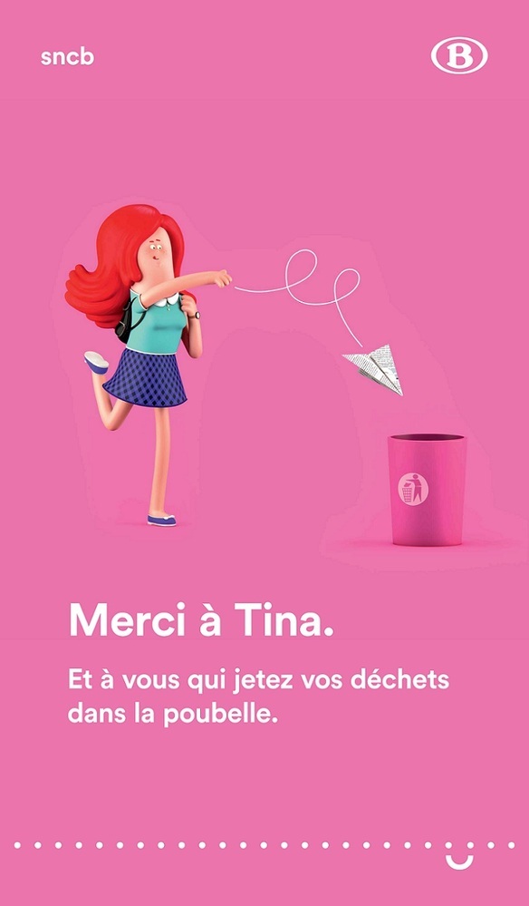 Deze roze affiche wil reizigers sensibiliseren om hun afval in de vuilnisbakken te gooien zodat de stations proper blijven. We zien centraal een afbeelding van een vrouw die een papieren vliegtuig naar een vuilnisbak gooit. Daaronder staat de titel in witte letters. Bovenaan staat ‘sncb’ en het logo van de NMBS.