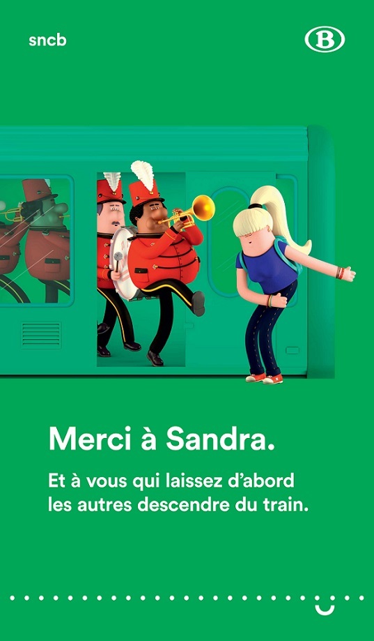 Deze groene affiche wil reizigers sensibiliseren over de beleefdheidsregel om eerst anderen te laten uitstappen voor zelf in de trein te stappen. We zien centraal een afbeelding van een vrouw die een fanfare uit de trein laat stappen. Daaronder staat de titel in witte letters. Bovenaan staat ‘sncb’ en het logo van de NMBS.