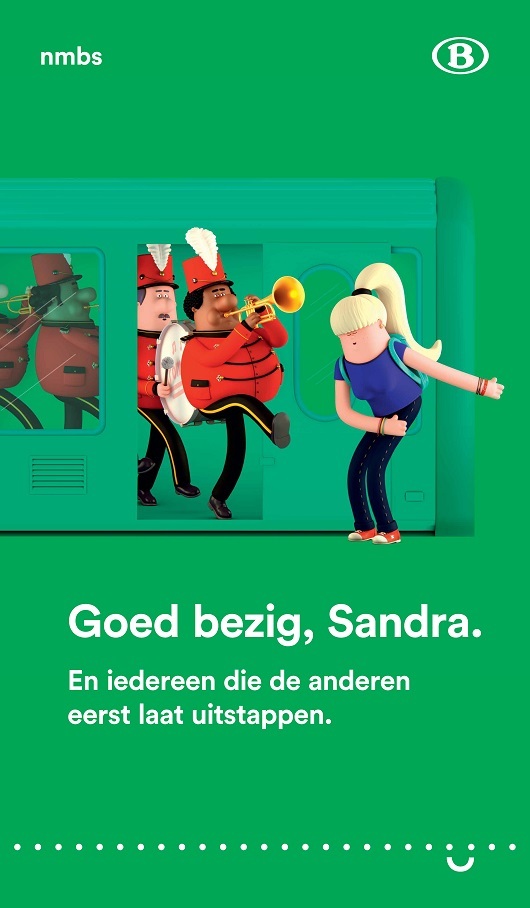 Deze groene affiche wil reizigers sensibiliseren over de beleefdheidsregel om eerst anderen te laten uitstappen voor zelf in de trein te stappen. We zien centraal een afbeelding van een vrouw die een fanfare uit de trein laat stappen. Daaronder staat de titel in witte letters. Bovenaan staat ‘nmbs’ en het logo van de NMBS.
