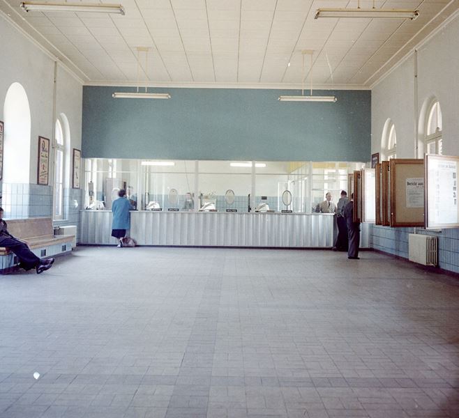 Deze fotogroep bestaat uit twee negatieven. Ze tonen de gemoderniseerde wachtzaal en loketten van het derde station in Hasselt. Tegen de muren hangen affiches en verplaatsbare borden met informatie over de dienstregeling. Twee reizigers bestellen een vervoerbewijs aan het loket. Links staat een zitbank waarop een reiziger de komst van zijn trein afwacht.