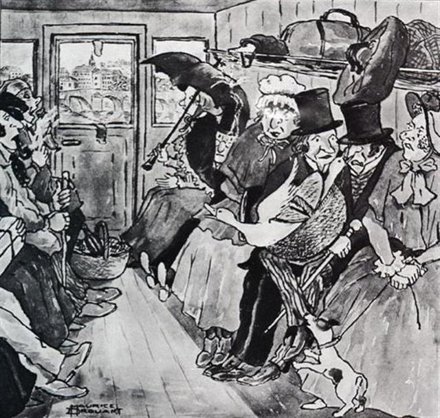 Humoristische prent in zwart-wit die een overvol rijtuig toont. Aan de rechterzijde zijn twee heren in gesprek. Onderaan lezen we wat ze tegen elkaar zeggen: "-Vous aussi, vous voyagez pour vos affaires? -Oh! Non! c'est... aïe!.. pour mon agrément.." Schenking van dhr. Marechal.