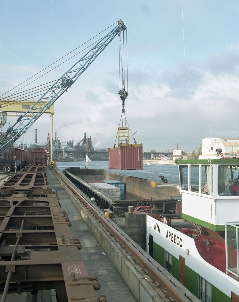 De groep bevat 59 negatieven. Op de eerste foto's zien we het laden van een container op een binnenschip met een klassieke kraan, die naast een sleep platte wagens op de kade naast het schip staat opgesteld. Dan volgen foto's van het containerpark op de kade met een portaalkraan. Op de laatste foto's is een heftruck aan het werk binnen in een magazijnruimte.