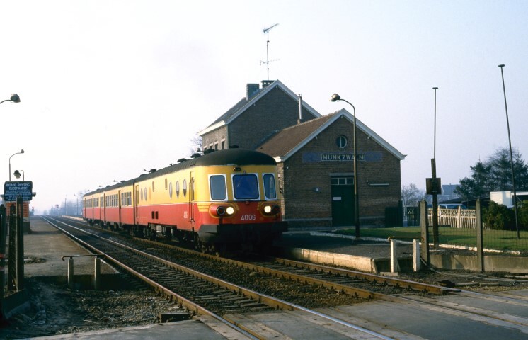 Deze fotogroep bevat twee dia's. Motorwagen 4006 is aangekomen in het station. We zien een deel van het stationsgebouw en de perrons met de verlichting. Op het volgende beeld zien we de motorwagen bij vertrek uit het station. Schenking van Myriam Hendrickx.