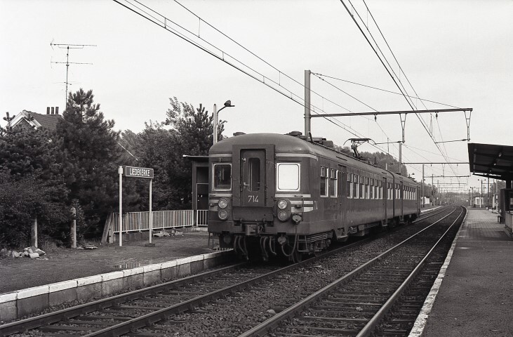 Dit motorstel behoort tot de reeks 06, schijf 1974. Het bevindt zich aan het perron van station Liedekerke. Dit motorstel rijdt op spoorlijn 50 richting Ternat. Beide perrons zijn voorzien van luifels. Links op het perron zien we een stationsnaambord. Het gebouw links, wat verscholen achter de bomen, is het stationsgebouw. Schenking van Myriam Hendrickx.