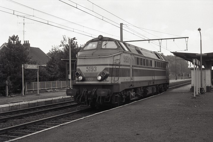 Deze locomotief behoort tot de reeks 51. Ze rijdt op spoorlijn 50 richting Denderleeuw. Beide perrons zijn voorzien van luifels en op het linkse perron zien we een stationsnaambord. Het gebouw links, wat verscholen achter de bomen, is het stationsgebouw. Schenking van Myriam Hendrickx.