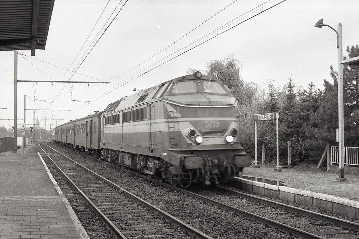 Deze locomotief behoort tot de reeks 51. Ze heeft M 3-rijtuigen aan de haak. Op het rechtse perron zien we een verlichtingspaal en een stationsnaambord. Aan het uiteinde van het perron links staat een mistbaken en 100 meter verder een lichtsein. Een deel van de perronluifel is nog net zichtbaar. Schenking van Myriam Hendrickx.