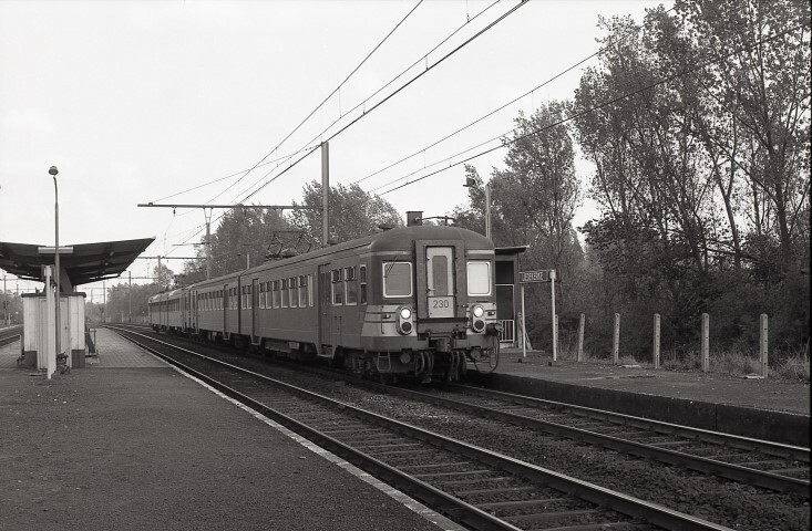 Dit motorstel behoort tot de reeks 00, schijf 1963. Het vormt samen met motorstel 673 een reizigerstrein. De trein bevindt zich op spoorlijn 50 A/2 richting Denderleeuw. Beide perrons zijn uitgerust met een luifel. Op het rechtse perron staat een stationsnaambord. Schenking van Myriam Hendrickx.