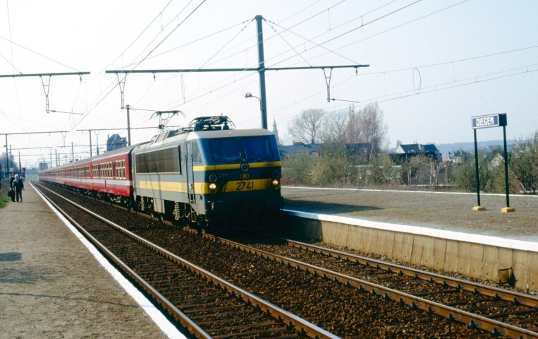 Elektrische locomotief 2741 komt aan in het station Diegem met een reizigerstrein samengesteld uit M 4-rijtuigen. Op het perron rechts staat een stationsnaambord.