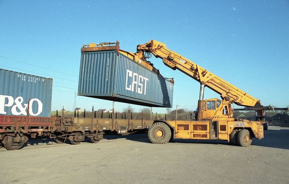 BeschrijvingDe groep bevat 28 negatieven. Een zware heftruck 'Belotti' laadt een container op een platte goederenwagen met rongen. Enkele foto's tonen een overzicht van de containerterminal en de sporen ernaast.