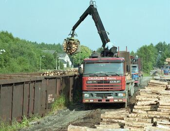 BeschrijvingDe groep bevat 10 negatieven. Ze tonen het laden van open stortwagens met boomstammen. Kranen op de vrachtwagens verschepen bundels boomstammen.