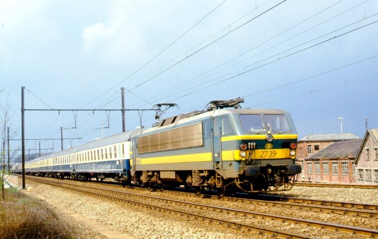 Deze fotogroep bevat twee dia's. Elektrische locomotief 2739 sleept een internationale trein samengesteld uit Duitse rijtuigen. De locomotief is blauw geschilderd met brede gele banden.