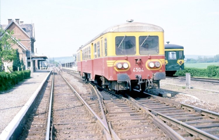 Deze fotogroep bevat twee dia's. Motorwagen 4504 staat aan het perron in station Beauraing. Links zien we het stationsgebouw. Op het naastliggende spoor staat een motorwagen reeks 49. Op de volgende dia is motorwagen 4504 vertrokken uit het station. Hij rijdt op een verhoogde spoorwegberm. Schenking van Myriam Hendrickx.